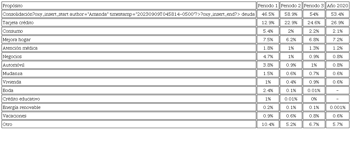 La variable que representa el motivo del préstamo se divide en doce categorías que los prestatarios eligen al momento de la solicitud. Estas categorías son: consolidación de deuda, tarjeta de crédito, mejoras del hogar, consumo, atención médica, negocios pequeños, automóvil, mudanza, vivienda, vacaciones, energía renovable, boda, crédito educativo, y otros. Los motivos más comunes son el refinanciamiento de deuda y el pago de tarjetas de crédito. En la Tabla 9, se presentan los porcentajes para las categorías mencionadas. La identificación de los propósitos del préstamo es importante para identificar el estado del préstamo (pago o impago) según el propósito. Se observa que para los propósitos más comunes (consolidación de deuda y tarjeta de crédito) el porcentaje de defaults respectivo es de 1% y 6.5% para el periodo 1, 11% y 3.5% para el periodo 2, 5% y 1.7% para el periodo 3, y finalmente, en el año 2020, 0.02% y 0.01%, considerando que la mayor parte de los préstamos colocados en este año siguen vigentes.