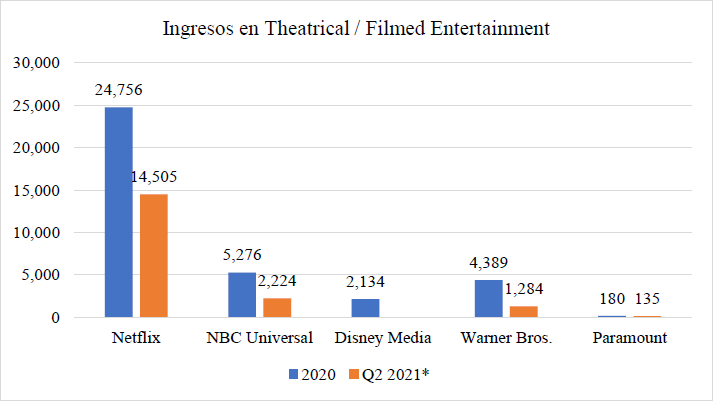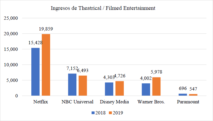 Todas las empresas cinematográficas con un modelo de estrenos theatrical, bajaron sus ingresos del 2019 al 2020. Netflix fue la única empresa con enfoque streaming, y sus ingresos subieron casi 5 mil millones de dólares. (Reporte anual, 2019)