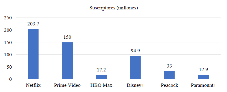 En el presente apartado, se revisan la cantidad de suscriptores y los precios de las plataformas de streaming más importantes en el mercado. Tomando en cuenta que Netflix, Prime Video y Disney+ son las plataformas más dominantes en este aspecto, como plantea Martínez (2021).
