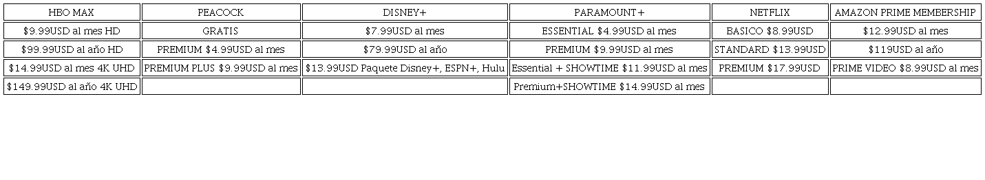 En el presente punto, se hizo una investigación de cada servicio que se ha mencionado sobre sus precios a los suscriptores.