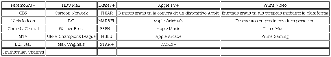 Como se puede observar en la tabla y de acuerdo con datos obtenidos de las empresas, existen varios paquetes a distintos precios para cubrir las necesidades de entretenimiento de los usuarios. Esto por medio de estrategias con otras empresas que permitan extender el catálogo de cierta plataforma, empresas que cuentan con contenido cinematográfico. pero que no cuentan con su propia plataforma. Por ejemplo, Paramount+, que cuenta con un catálogo variado como programación de CBS, Nickelodeon, Comedy Central, MTV, BETStar, Smithsonian Channel y sus propias series de Paramount+ Originals.