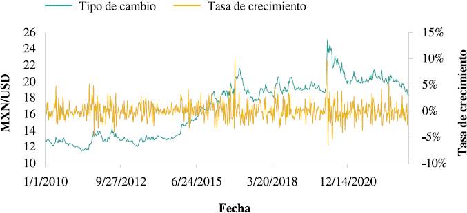 La Gráfica 1 detalla el comportamiento del tipo de cambio en pesos por dólar, tanto en valor nominal, como en su tasa de crecimiento, donde se puede observar una tendencia alcista a lo largo de la década 2010-2020; es decir, una depreciación del peso hasta el año 2020, año en que experimentó una disminución, una apreciación del peso, la cual se debe principalmente a la pandemia global provocada por el COVID-19, la cual impactó en los mercados económicos y financieros a nivel internacional. Respecto a la tasa de crecimiento, se observa un mayor número de tasas positivas que negativas, donde a mediados de noviembre de 2016 se vivió la mayor depreciación del peso, en un 9.94% producto del triunfo de Donald Trump sobre Hillary Clinton en las elecciones presidenciales de Estados Unidos, y precisamente a inicios de marzo de 2020, se tuvo la mayor apreciación del peso, derivado de los primeros casos de pandemia.