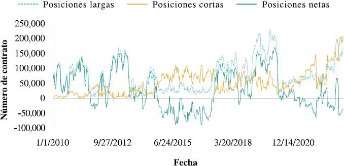 En la Gráfica 2 se muestra el comportamiento de las posiciones largas, cortas y netas mantenidas por los especuladores, lo cual muestra una perspectiva respecto a las expectativas en el tipo de cambio, donde una posición neta positiva implica que los participantes en el mercado están comprando más pesos que los que se están ofreciendo; por su parte, una posición neta negativa, indica que los participantes en el mercado están vendiendo más pesos que los que se están demandando. En dicha gráfica se puede observar que las posiciones netas han tenido una variación importante, en el primer lustro de la década comprendida entre 2010 y 2020, las posiciones netas mostraron una tendencia a la baja, los siguientes dos años se tuvo una tendencia lateral, y en los siguientes tres años una tendencia alcista, sin embargo, a partir de 2020 se experimentó una tendencia bajista nuevamente.