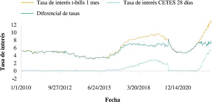 En particular, se analiza la situación para México en el periodo comprendido entre el 1 de enero de 2010 y el 1 de marzo de 2023, se ha elegido dicho periodo para minimizar el riesgo de incluir datos temporales que pudieran estar correlacionados con la crisis económica mundial de 2008. Los datos son de frecuencia semanal. El tipo de cambio ha sido tomado de Banxico, mientras que, la información relativa al mercado de futuros ha sido obtenida del Chicago Mercantile Exchange (CME), y finalmente, los datos respecto a las tasas de interés de México y Estados Unidos serán tomados de Banxico y la Federal Reserve, respectivamente.