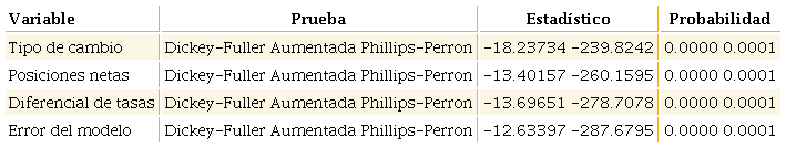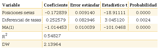 Se espera que el coeficiente de α1 sea negativo, ya que implica que hay una relación negativa entre las posiciones netas y el tipo de cambio; por ejemplo, si los participantes en el mercado están comprando más pesos que los que se están demandando, lo anterior reflejaría una tendencia del peso hacia la apreciación, es decir, un tipo de cambio más bajo. Mientras que, el signo esperado de α2 es negativo de acuerdo al enfoque de activos, en particular con precios rígidos, aunque es posible la obtención de un coeficiente positivo de acuerdo al mismo enfoque pero considerando precios flexibles, tal como lo han encontrado Torre y Provorova (2007), donde concluyeron que ante un incremento en el diferencial de tasas existe una depreciación de la moneda, es decir, un tipo de cambio más alto.
