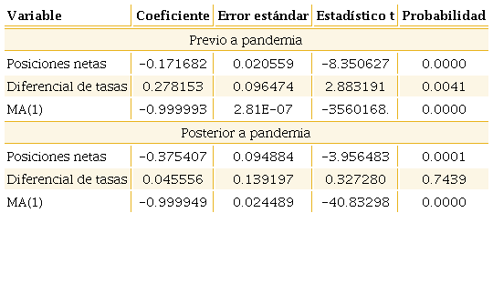 Es así como en el Cuadro 4 se plasman los resultados de la regresión acotados por la pandemia, donde se pueden destacar un par de hechos relevantes. El primero, las posiciones netas son significativas tanto antes como después de la pandemia; sin embargo, el efecto sobre el tipo de cambio es considerablemente mayor en la situación posterior a pandemia, lo que podría explicarse debido a la incertidumbre de los mercados financieros internacionales y con ello, a la adquisición de mayor relevancia del mercado de futuros, así como de la especulación sobre las variaciones del tipo de cambio.