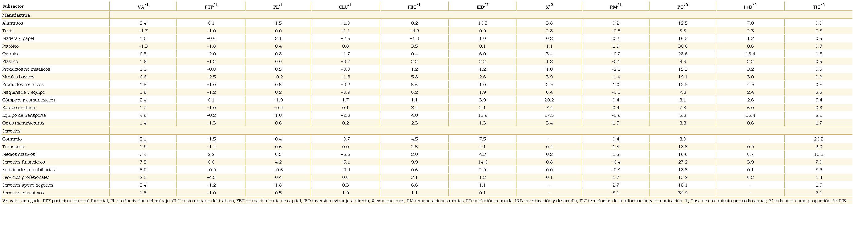 En lo que concierne al sector servicios, el efecto de la apertura económica no es distinto de la tendencia en la industria de la manufactura; ahí también hay, en general, una lenta expansión del valor agregado, de la productividad y de la formación de capital. No obstante, existen algunos subsectores con mejor desempeño, como los servicios de información en medios masivos y financieros; en ambos se observa un aumento sostenido de la eficiencia que es consistente con el crecimiento de la inversión fija bruta, la fuerte presencia de IED y la innovación tecnológica.