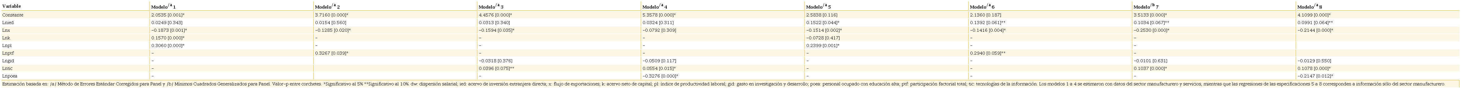 Empíricamente, el contraste de hipótesis se lleva a cabo en dos fases: la primera, modelos (1) al (4), las estimaciones toman pie en las regularidades del conjunto de los 14 subsectores manufactureros; la segunda, especificaciones (4) a (8), las regresiones se focalizan en el comportamiento de las 5 industrias manufactureras altamente exportadoras (química, equipo eléctrico, cómputo, automotriz y maquinaria y equipo). Por procedimiento, primero evaluamos la mejor especificación panel, según el contraste de Hausman; segundo, probamos si los parámetros estimados son consistentes y eficientes con fundamento en los estadísticos de Wald, Pesaran y Wooldridge, los cuales indicaron la presencia de heteroscedasticidad, correlación contemporánea y serial, respectivamente. Por consiguiente, procedimos a emplear el método de Errores Estándar Corregidos para Panel con el propósito de garantizar estimadores ortogonales (véase Anexo B).