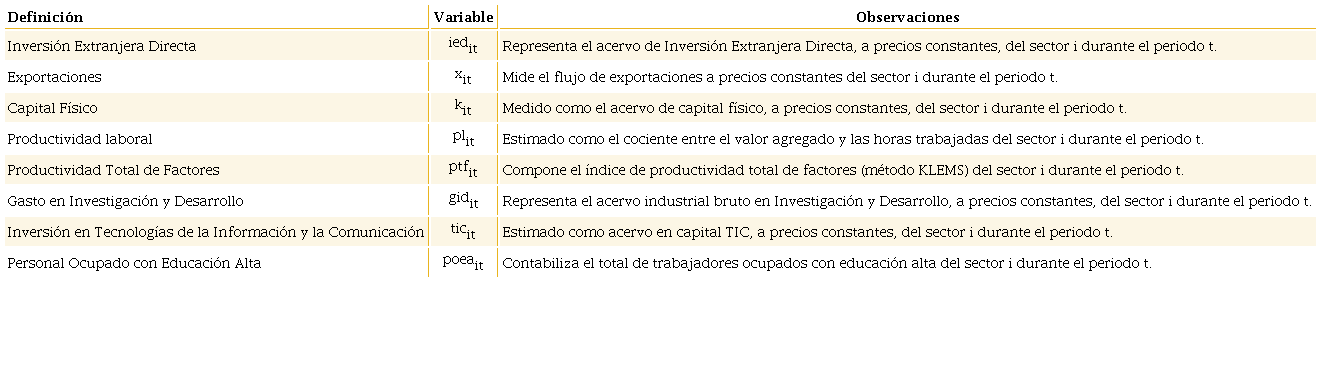 Donde e representan, respectivamente, las remuneraciones y el grado de eficiencia del sector en el periodo , mientras que , y miden la intensidad comercial, la IED y el capital humano de la industria en el periodo . En consecuencia, aquellos sectores (países) con una mayor apertura económica y capacidad de innovación/inversión, tenderán a incrementar su nivel de productividad/competitividad y, con ello, a reducir la dispersión salarial.