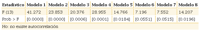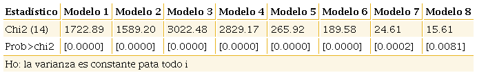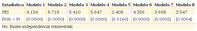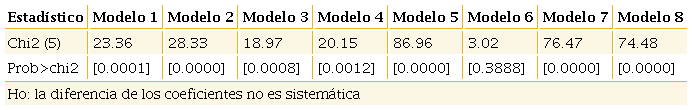 En esta ecuación representa la heterogeneidad no observable que varía únicamente entre las unidades de estudio, es un componente que cambia sólo en el tiempo y es el término de error puramente aleatorio. Asumiendo que , entonces la ecuación (11) queda acotada a las siguientes formulaciones:3i) datos agrupados, ii) efectos fijos y iii) efectos aleatorios; por procedimiento, se empleó la prueba de Hausman para elegir la mejor especificación panel.