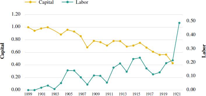 In Figure 1 the total participation of labor increases over time from values close to zero to fifty, towards the end of the period. The first years is the baseline for these indexes. The main trend of capital participation is decreasing during the period under analysis, going from one to 0.20 in 1921.