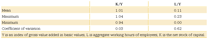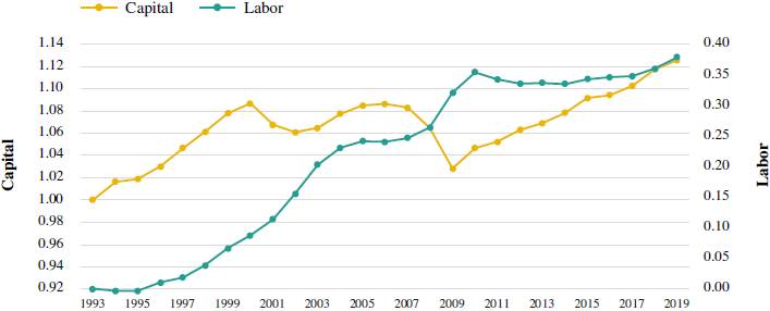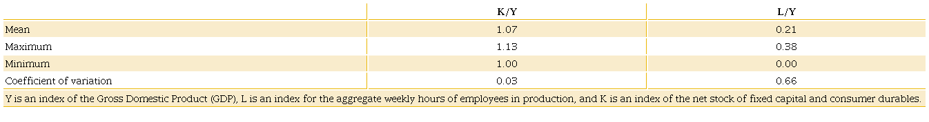 In Table 2 the largest mean belongs to capital participation with a value of 1.07, for the period from 1993 to 2019. Meanwhile, labor has the lowest mean with a value of 0.21 for the same period. Regarding the coefficient of variation, capital participation has a value of 0.03 which is much lower, than the corresponding labor coefficient of variation of 0.66. These values indicate that labor participation has a greater dispersion around the average, than the capital factor. Probably, the labor market is more unstable than the capital market.