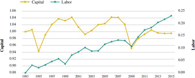 Figure 3 presents the capital and labor participation in the product for Mexico. Labor participation increases during the period of 1993-2015, since it goes from values close to zero percent to around 25 percent. Regarding the capital participation, it has ups and downs in its behavior with substantial short-term falls in 1994, 2001, and 2009 which are linked to the devaluation of the Mexican peso, because of the Tequila Effect, the rise in the oil price, and the Great Recession, respectively. The minimum value of it is 0.94, while its maximum value is 1.04, indicating that its dispersion around the mean (1.01) is not larger.