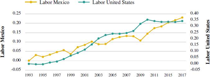 Figure 4 shows that labor participation in the United States is largest with 35 percent in 2015, than in Mexico during the period under analysis having 1993 as base year. Meanwhile, the same participation in the product for the case of Mexico grows modestly reaching values close to 25 percent.