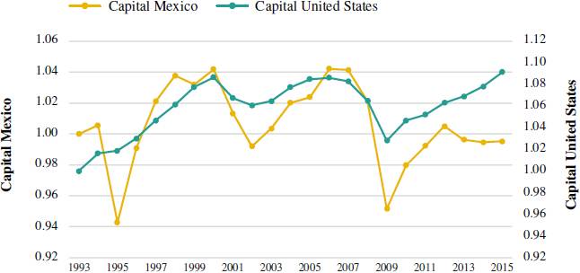 Figure 5 shows that capital participation in the product for Mexico and the United States are somehow similar. In 1994 capital participation fell in Mexico (from 1.03 to 0.945), while in the United States this share increased slightly (from 1.020 to 1.025). Global financial phenomena such as the rise in oil prices in 2001, and the Great Recession in 2009 affected in a similar fashion capital participation for both economies. The economy of the United States shows greater resilience to these types of external shocks, since it depicted the smaller coefficient of variation -Tables 2 and 3, in comparison to the Mexican economy.