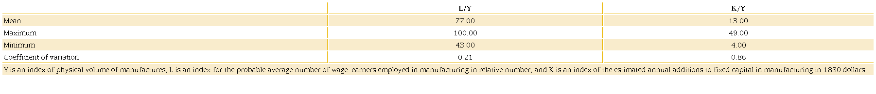 Regarding column one of Table 4, the estimates obtained after applying the algorithm to the data published by Cobb and Douglas (1928) are reported. This algorithm is found to provide identical results to those reported by these authors on page 151 of their paper:20