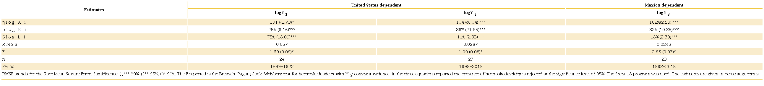 where Y is the product, A is the technology, represents total factor productivity estimate, K represents the capital factor, L is the labor production factor, represents the estimate of the marginal participation of the capital factor in the product, represents the estimate of the marginal participation of the labor factor in the product, is the subindex that identifies the country and its periods: 1 stands for the United States during the period 1899-1922; 2 indicates the United States for the period 1993-2019; 3 indicates Mexico for the period 1993-2015, refers to logarithms.
