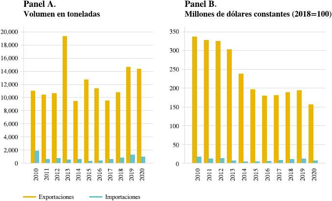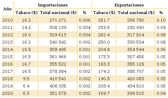Con base en la Tabla 2, si bien en términos absolutos el valor de las exportaciones promedio es de 180 mdd para el periodo 2015-2020, en términos relativos representan el 0.05% con respecto al total nacional y se observa una tendencia a la baja en los últimos 10 años. Por su parte, la participación de las importaciones de tabaco con respecto al total nacional es ínfimo. La Tabla 2 muestra que ambos indicadores distan mucho del 1% con respecto al total nacional. En México las importaciones y exportaciones de los cigarrillos son muy reducidas tanto en el contexto nacional como internacional. Si bien, año tras año se observa una balanza comercial superavitaria, ésta representa una aportación mínima con respecto al agregado nacional.