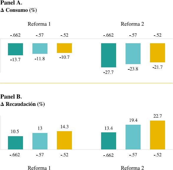 Por lo anterior, se plantean los siguientes dos escenarios de reforma: a) escenario 1, elevar el IEPS específico a $1.00 por cigarrillo y, b) escenario 2, incrementar la cuota fija a $1.50 por unidad. Además, se analiza el efecto en el consumo de cada reforma con base a las siguientes EPDT: a) -0.52 estimada en Jiménez-Ruiz et al. (2008) que suma elasticidad-precio y elasticidad de participación, b) -0.57 obtenida de Sáenz de Miera et al. (2013) actualizada al igual que en Jiménez-Ruiz et al. (2008) y, c) -0.662 calculada en este trabajo empleando el método econométrico de Deaton (1997) de valor unitario de un producto. Cabe mencionar que esta elasticidad es la primera actualizada con el método citado en nuestro conocimiento para México y que es sensiblemente algo mayor que las previas, que se encuentra en línea con evidencia reciente para Serbia usando el mismo enfoque econométrico y una elasticidad de -0.632 (Vladisavljevic et al., 2020).