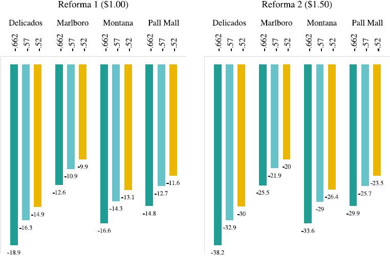 Por último, la Figura 3 ilustra las caídas en el consumo pero ahora por cada marca de cigarrillos para cada EPDT. La marca Marlboro es la que presentaría una menor caída en el consumo con reducciones en las cantidades en el rango de -9.9% a -12.6% en la reforma 1, y de 20% a 25% en la reforma 2, nada mal según la EPDT de referencia y la evidencia reportada para otros países. En cambio, la mayor caída en el consumo se observaría en la marca Delicados, con valores en el rango de -14.9% a -18.9% en la reforma 1, y de -30% a -38.2% en la reforma 2, marca que ha sido preferida por estratos socioeconómicos más bajos. Dicha evidencia va acorde con los trabajos de Chaloupka et al. (2012), Vladisavljevic et al. (2020) y Huesca et al. (2021), que señalan la importancia de incrementar el componente específico del IEPS ya que aumenta la carga tributaria de las cajetillas de cigarrillos más baratos, lo cual permite tener mayor incidencia en la reducción de su consumo y evitará que ante un escenario de reforma impositiva, no se observen cambios de demanda hacia marcas más baratas.