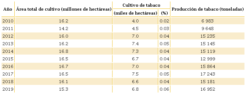 Cabe destacar que durante el periodo 2009-2011 hubo una iniciativa de reconversión de dicho cultivo a través del Programa de Reconversión Productiva, como parte del compromiso asumido por México tras la ratificación del CMCT. Las iniciativas por la reconversión del cultivo de tabaco implicaron que, en los años 2009, 2010 y 2011 se observara a su vez los menores niveles de producción. Sin embargo, dicha iniciativa no tuvo éxito por problemas operativos del programa (De Dios et al., 2019), por lo que a partir del año 2012 se observa una recuperación. A partir de dicho año a la fecha, el porcentaje del tabaco en el área total de cultivo se mantiene sin cambios (en el rango del 0.04% y 0.06%). En general, las hectáreas cultivadas y la baja producción nacional, dan cuenta de que la industria del tabaco constituye un cultivo menor.