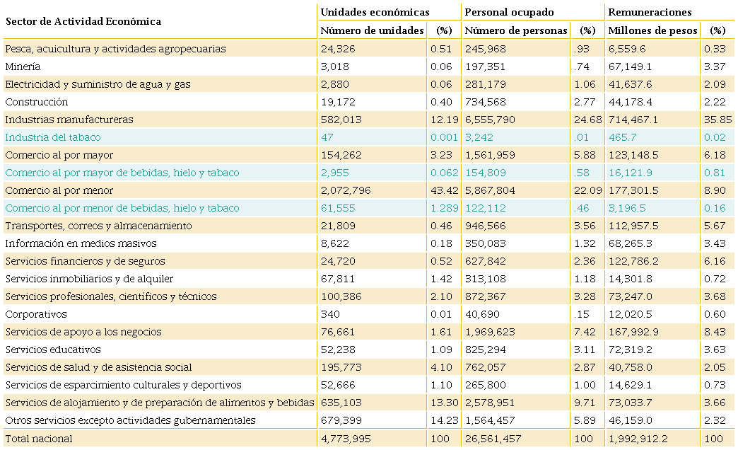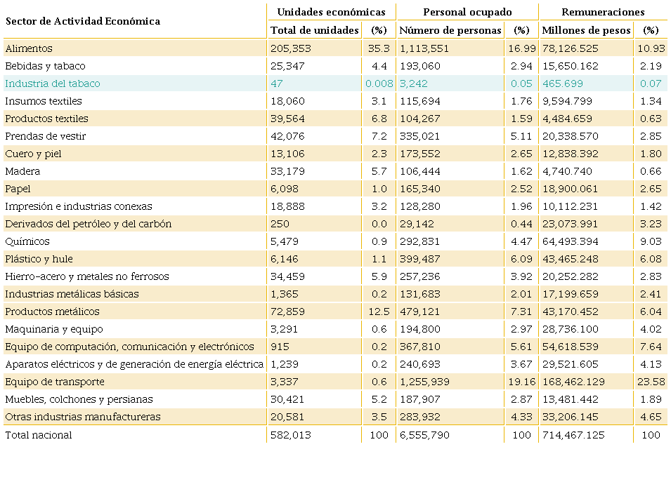 La Tabla 4, contextualiza el subsector del tabaco al interior del sector económico de las industrias manufactureras. Destaca que en cinco industrias se aglomera el 67.7% de unidades económicas manufactureras en todo el país: industria alimentaria (35.3%), fabricación de productos metálicos (12.5%), fabricación de prendas de vestir (7.2%), fabricación de productos textiles (6.8%) y fabricación de productos a base de minerales no metálicos (5.9%). En este sentido, la participación de la industria del tabaco es del 0.008%; esto es por mucho inferior al 1% de las unidades económicas, lo que da cuenta que es una industria menor no solo a nivel nacional, sino que también con respecto al resto de la industria manufacturera.