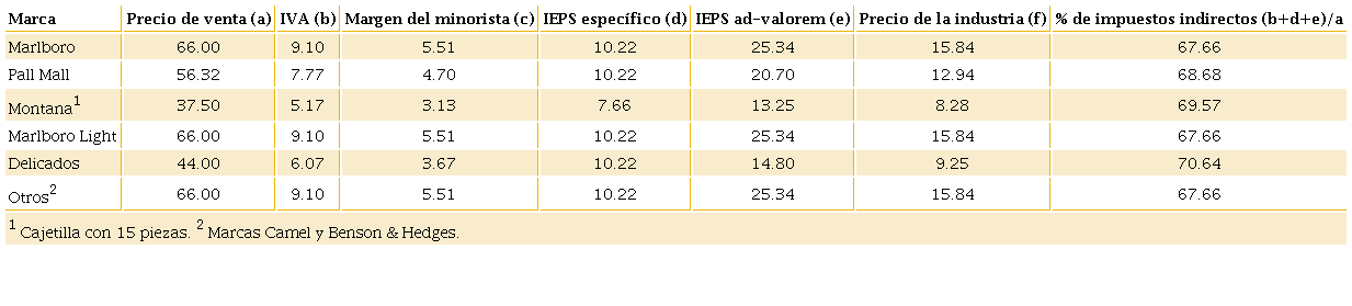donde se refiere al precio de venta de la cajetilla de cigarros, con base al costo de producción de la industria tabacalera,2iepsadv al gravamen de 160% del IEPS ad-valorem, iepsesp a la cuota fija específica por concepto de IEPS, md al 10.72% como porcentaje del margen de utilidad del detallista (siguiendo a Waters et al., 2010) y el impuesto al valor agregado (IVA) a la tasa del 16%.3