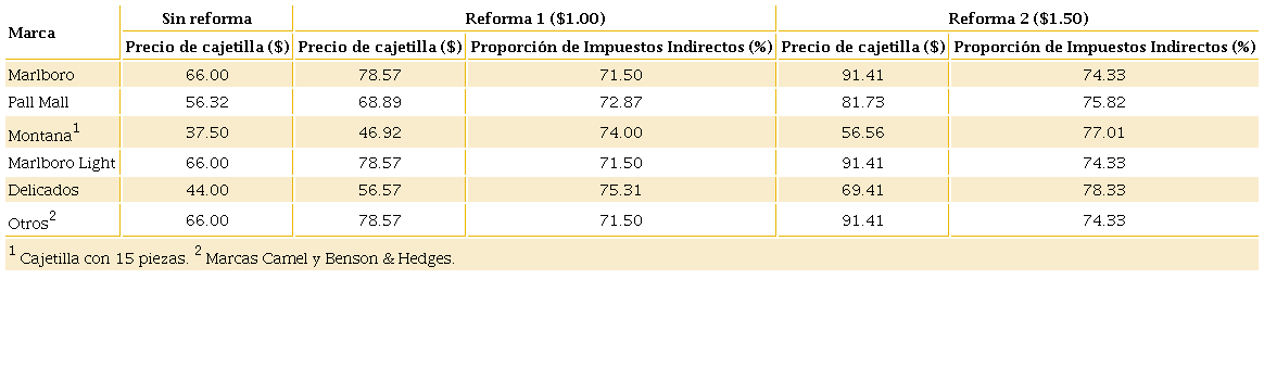 Con relación a la proporción de los impuestos indirectos con respecto al precio final, se observa que en el escenario de Reforma 1 únicamente la marca Delicados logra elevar la carga al 75%, en tanto que con la reforma 2 las marcas Pall Mall, Montana y Delicados superan dicho nivel. Tanto la marca Marlboro, que es la de mayor participación en el mercado (Pan American Health Organization e Instituto Nacional de Salud Pública, 2017), como las marcas de Marlboro Light, Camel y Benson & Hedges, no elevan la proporción de los impuestos indirectos al 75% bajo ninguno de los dos escenarios planteados; por ello, es conveniente proponer escenarios de reforma alternos para que la incidencia sea superior en todas las marcas de cigarros y empatarlas con las recomendaciones de la OMS con una carga fiscal indirecta total del 75% del precio final.