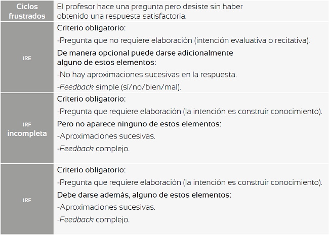 Para identificar un ciclo, lo primero es considerar que estos comienzan con una orden o pregunta inicial y finalizan cuando esta es satisfecha; es decir, cuando se alcanza un acuerdo compartido por los interlocutores. Posteriormente, establecidos los ciclos de cada episodio se inicia el segundo paso del análisis: la identificación de las estructuras de participación, que nos permiten describir cómo se organizan comunicativamente los ciclos de interacción que surgen en cada caso en estudio. La tabla 1 presenta y sintetiza los criterios para la clasificación de las estructuras de participación trabajadas: IRE (iniciación, respuesta, evaluación); IRF (iniciación, respuesta, feedback) e IRF incompleta.