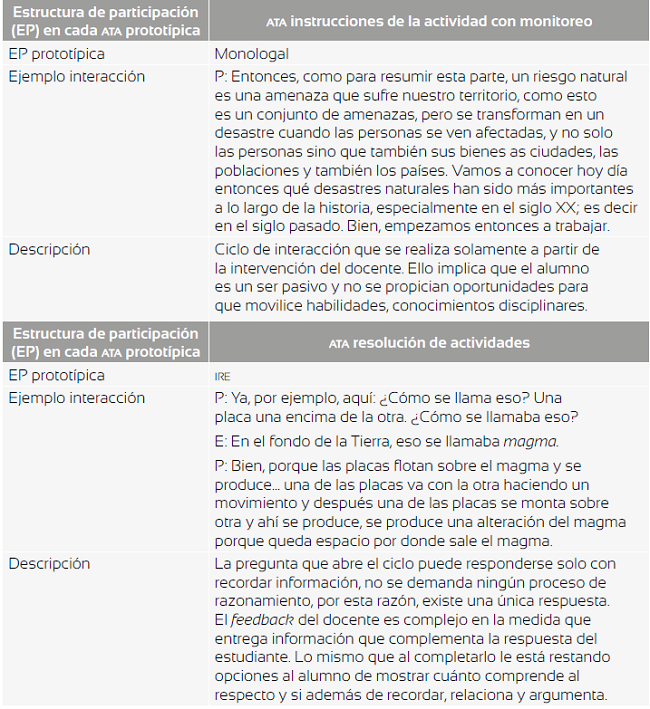 Respondiendo al análisis de la interacción que surge en el aula a partir del despliegue de las diferentes unidades de análisis, es necesario responder a la forma como se organizan los ciclos de interacción. Para ello, la tabla 3 muestra la estructura de participación predominante en cada ATA prototípica de este estudio de caso.