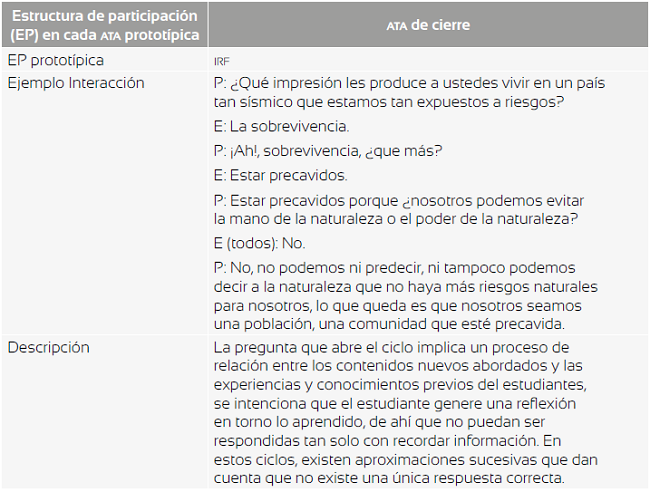 Pese a esto, durante la ATA actividad de cierre, las interacciones se organizan predominantemente a partir de la estructura de participación IRF, lo cual aumenta la participación de los estudiantes. En cuanto al tipo de preguntas planteadas por el docente, estas se enfocan en fomentar per manentemente la reflexión, valorización y vinculación de los contenidos abordados con experiencias previas de los estudiantes.