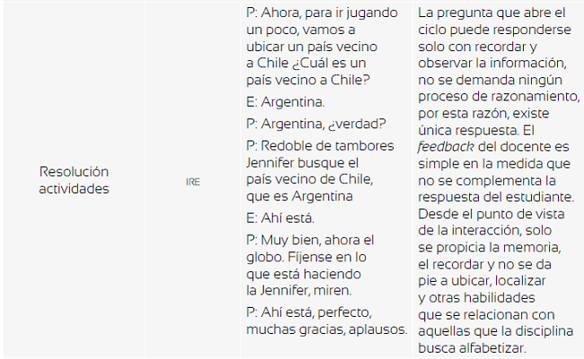 De manera específica, los intercambios comunicativos prototípicos se organizan a partir de la estructura IRE y Monologal, lo que demuestra que las preguntas realizadas por el docente están orientadas de forma exclu siva a evaluar la adquisición de los contenidos conceptuales abordados en el desarrollo del episodio o consolidar los contenidos trabajados, sin propiciar intercambios comunicativos con los estudiantes, salvo relevando lo meramente memorístico. Pese a lo anterior, las interacciones que se propician en este nivel son, en parte, coherentes con lo propuesto desde el Currículum Nacional, dado que los objetivos en este nivel pretenden desarrollar el pensamiento geográfico desde el reconocimiento de diversos conceptos, categorías y uso de herramientas geográficas. No obstante, si lo que se proyecta es la alfabetización en el área, más que recordar el alumno debiera comprender, relacionar y aplicar los conceptos y para ello otro tipo de interacciones debieran darse, claramente en las que sea más activo. De ahí que recordar los conceptos solo constituye un primer eslabón para la posterior adquisición de habilidades y actitudes propias de la disciplina orientada a desarrollar una mirada integral y una mejor comprensión de lo que está ocurriendo en el mundo actual.