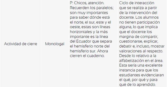 De lo anterior se desprende que las estructuras de participación prototípicas de la unidad son de tipoIREy monologal, revelando que el conocimiento se construye a partir de preguntas que pueden ser res pondidas sólo a través del recuerdo de información adquirido durante el desarrollo de la actividad. Asimismo, esta perspectiva vinculada con un tipo de enseñanza tradicional basada en la memorización y repetición de los saberes, da cuenta que el docente es quien interviene en la mayoría del tiempo, planteando preguntas de carácter evaluativo, e incluso, trans mitiendo información de manera monologal para aclarar los contenidos abordados, sin propiciar intercambios comunicativos con los estudiantes.