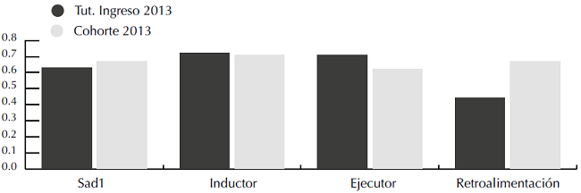 Posteriormente se propone comparar el diagnóstico de los tutores y los estudiantes con más de un año en la institución, de acuerdo a los resultados obtenidos en esta cohorte para el indicador SAD2, que mide el desarrollo de competencias al segundo año de permanencia en la institu ción. En términos generales, el índice SAD es similar, aunque los estudiantes cohorte 2013 que se desempeñan como tutores el año 2014 presentaron un promedio SAD inferior al promedio de su cohorte al responder la encuesta como alumnos de primer año, en 2013 (figura 2).