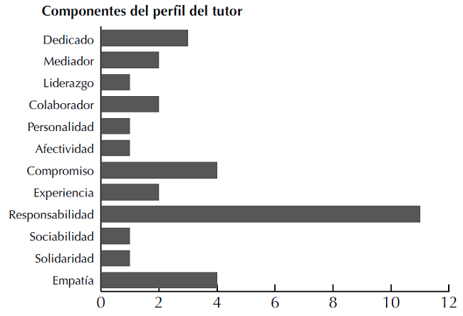 Los tutores en general en los grupos focales reconocen la existencia de un perfil que los diferencia de los tutorados (79 % de los participantes señalan dicha situación). El grupo de tutores define su perfil como caracterizado principalmente por ser responsables, comprometidos y empáticos. Los tutores con un semestre en su labor la describen, en general, como sigue: "Si bien hay un perfil por carrera, pero creo que todos tenemos caracte rísticas en común, como empatía, solidaridad, sociabilidad, etc. Y estas características responden a un perfil" (Tutor, Masc., 20, 1).