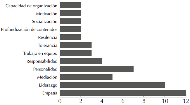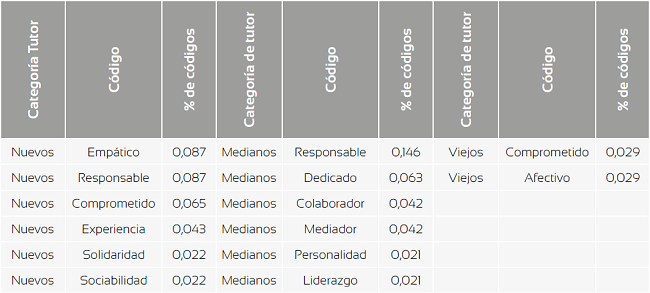 En este caso, el desarrollo de las competencias de empatía, liderazgo y personalidad (entendido por los tutores como la capacidad de dirigirse a grupos y profesores con soltura) aparecen en general destacadas por los tres grupos de tutores, aunque dependiendo de las circunstancias que enfrentan de manera particular en el desempeño de su labor, les lleva a reconocer otras más: "Nosotros nadamos contra la corriente y eso, en mi caso, me ha permitido desarrollar más tolerancia a la frustración y un nivel más avanzado de resiliencia" (Tutor, Masc., 23, 3).