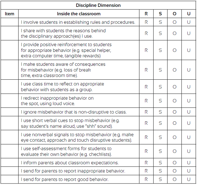 The purpose of this questionnaire is to examine classroom management practices in three different dimensions: Discipline, Teaching and Learning, and Person. Your responses will be treated with the utmost confidence and will be used only for academic research purposes. This inventory is anonymous and your participation is voluntary. We appreciate your willingness to contribute in our research study.