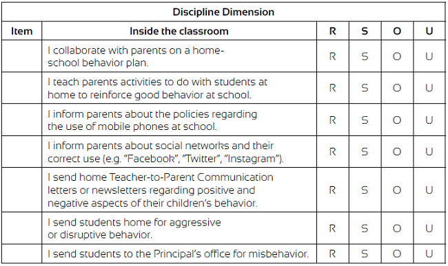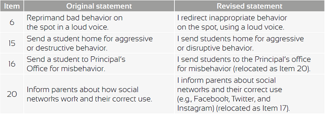 One of the weaknesses detected in some of the inventories analyzed is the language used to formulate the items. Let us take the case of the PCI form. There are just 2 out of the 20 items, which convey a positive sense when reading it. The remaining 18 items convey a quite negative message when referring to student misbehavior, persistently highlighting discipline and order, which obviously would not depict current views on classroom management. It may be evident enough for teachers what responses are expected from them, even though the questionnaire is anonymous, which may lead to unreliable answers.