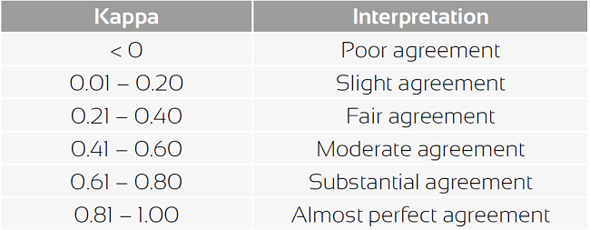 Fleiss' Kappa evaluates the concordance or agreement between multiple raters. It is a measure of the degree of agreement that can be expected above chance. Agreement can be thought of as follows: If a fixed number of people assign numerical ratings to a number of items, then the Kappa will give a measure for how consistent the ratings are. Table 1 describes the benchmark scale that Landis and Koch (1977) proposed, one of the most widely used benchmark scales to value the degree of agreement between raters in function of Kappa.