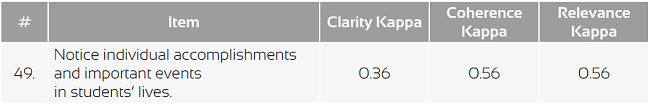 In the case of the Personal dimension, there is a moderate agreement, a substantial agreement or an almost perfect agreement among raters in almost every item. Table 10 shows that there is just one exception in item 49, where the agreement level among raters is considered as fair.