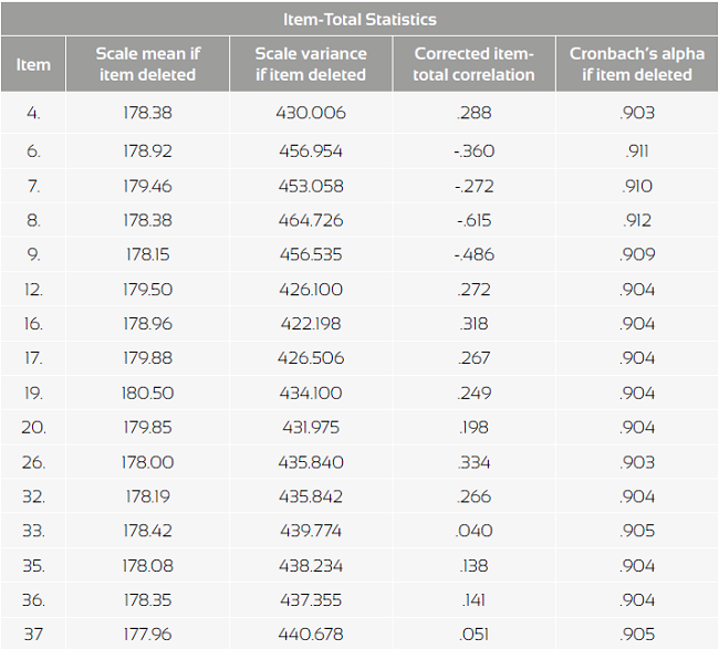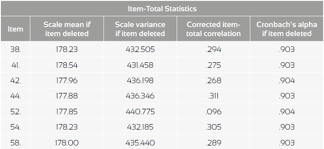 Some interesting values were found while performing the item-per-item analysis. According to Gliem and Gliem (2003), the minimum score for an item to be considered correlated with the total test score is between 3.5 and 4. The values below this score have a low level of correlation. According to the results obtained and shown in Table 11, the correlation item-test works well in general terms. However, there is a significant number of items that are below the minimum value of 3.5 (Gliem & Gliem, 2003), to be consid ered correlated with the total test score. Items below 3.5 are 4, 6, 7, 8, 9, 12, 16, 17, 19, 20, 26, 32, 33, 35, 36, 37, 38, 41, 42, 44, 52, 54, and 58.