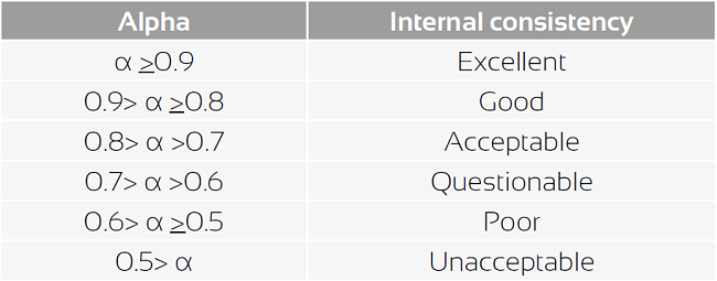 This technique is a measure of internal consistency of tests or questionnaires 270 in order to validate their reliability. It is commonly used in questionnaires with multiple Likert questions whose answers are neither correct nor incorrect, but each participant chooses the alternative that best depicts his or her own views on the construct intended to explore. Internal consistency refers to the extent to which a set of items in a questionnaire measures the same concept or construct that he or she intends to measure and, therefore, it is connected to the inter-relatedness of the items within the test. If the items in a questionnaire are correlated to each other, the alpha value is increased. These values range between 0 and 1, in which 0 means "no reliability at all" and 1 means "total reliability." The closer the alpha value is to 1, the higher the inventory's reliability. Table 2 represents the values proposed by George and Mallery (2003).