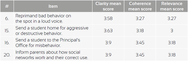 As stated previously, the suggested mean for an item to be accepted as appropriate (clear, coherent, relevant) is 3.25 or higher. Therefore, every item was considered as appropriate by the specialized subjects, with the exception of items 15, 16, and 20. These three items measured under the suggested mean score had to be revised in order to fulfill the characteristics of a properly written item. Additionally, items 16 and 20 were relocated to enhance the coherence among items within this dimension in order to be logical as the participant was reading the questionnaire. Items that narrowly surpassed the suggested mean score were also rewritten, as in the case of item 6.