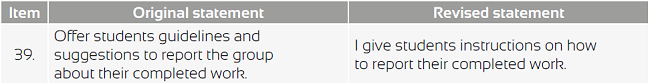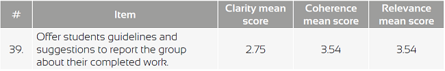 Table 6 shows the lowest mean score of the answers provided by the subjects for the items belonging to the Teaching and Learning dimension. In this case, specialized participants considered every item as appropriate, with the exception of item 39. The item, which was measured under the mean score suggested in terms of clarity, had to be revised in order to fulfill the characteristics of a properly written item. The changes made, following the comments and suggestions given by specialized participants, are shown in Table 7.