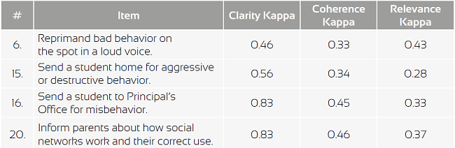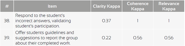 Table 8 shows items with the lowest Fleiss' Kappa coefficient in the Discipline dimension. As stated above, a Kappa value between 0.41 and 0.60 indicates a moderate agreement level, while ranges of values (0.61 to 0.80) and (0.81 to 1.00) indicate substantial and almost perfect agreement levels respectively. Therefore, according to the Fleiss' Kappa Coefficient applied to the instrument, there is a moderate agreement, a substantial agreement or an almost perfect agreement among raters in every item, with the exception of items 6, 15, 16, and 20, which were rated with a fair agreement among experts.