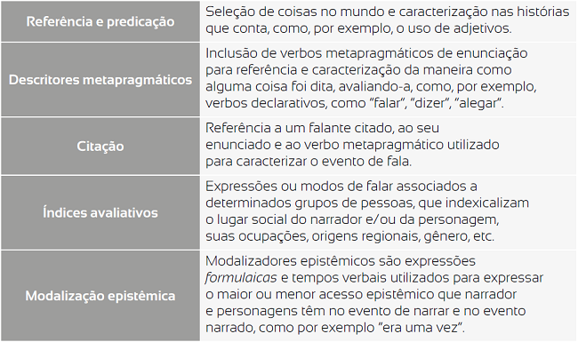 (1) referência e predicação, (2) descritores metapragmáticos, (3) citação, (4) índices avaliativos e (5) modalizadores epistêmicos. Essas pistas indexicalizadoras estão, para melhor visualização, alocadas no quadro a seguir: