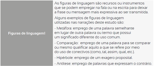 A partir da análise da narrativa, ficou nítido que a professora parti cipante fez uso de figuras de linguagem para narrar seu posicionamento em relação ao seu repertório linguístico. Dessa forma, fez-se necessário, também, considerar as figuras de linguagem como pistas indexicalizadoras, assim como o fez Bizon (2013), em sua tese de doutoramento. Bizon (2013, p.110) menciona Bauman (1977) e Wortham (2001) para salientar a "notória importância que a utilização de figuras de linguagem pode assumir na construção das narrativas". Além disso, ressalta que esses recursos "iluminam o cenário em foco na narrativa e chamam a atenção para determinadas cenas, contribuindo para o vozeamento e ventrilo-cução de narradores e personagens" (Bizon, 2013, p.110). Na narrativa gerada neste estudo, a professora utilizou imagens que se apoiaram em metáforas, comparações, hipérboles e antíteses. Sendo assim, ao quadro anteriormente apresentado, adiciono agora as figuras de linguagem como mais uma das pistas indexicalizadoras de vozes que utilizei para indicar os posicionamentos da narradora referente à questão que norteia este estudo: