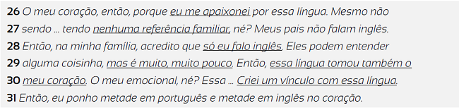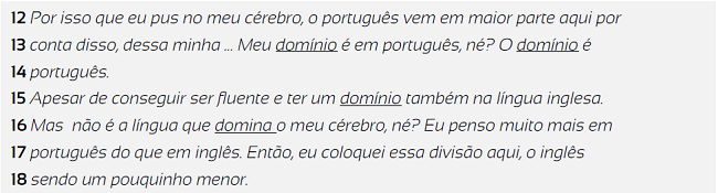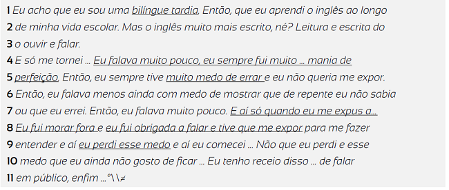 Em sua performance discursiva sobre seu repertório linguístico, a nar radora posiciona-se de modo que faz uso de descritores metapragmáticos para sinalizar sua relação de insegurança ao expor-se em ambas as línguas, como se pode observar no excerto que segue: