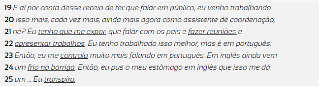 A narradora utiliza os descritores metapragmáticos -"tenho que me expor, fazer reuniões e apresentar trabalhos" (linha 21 e 22) - para descrever algumas de suas obrigações relacionadas ao falar em público exigidas em função do cargo de assistente de coordenação.