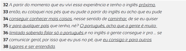 Nessa passagem, Carla posiciona-se quanto à sua experiência de morar fora do Brasil e predica o inglês como próximo (linha 32) a partir dessa vivência no exterior.